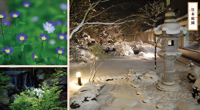 滝の流れる日本庭園が皆様に癒しのひと時をお届けします。春のツツジ、緑豊かな夏の木々、秋には美しい紅葉、そして冬には雪景色と、四季折々の表情をお楽しみいただけいます。開放的な大浴場からも庭園を望むことが出来ます。