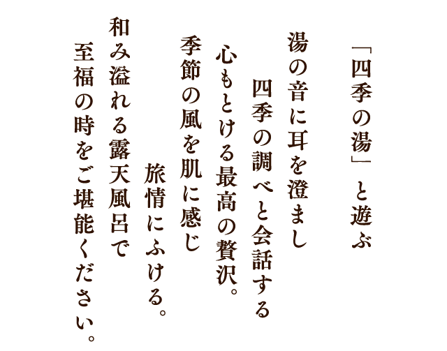 庭園にある露天風呂から、内湯から、ゆったりと温泉に浸かりながら、四季の移ろいを肌で感じてほしいという願いを込めて「四季の湯」と名づけました。 ■ 源質 カルシウム・ナトリウム-塩化物・硫酸塩泉 ■ 効能 神経痛・慢性皮膚病・外傷・五十肩・疲労回復